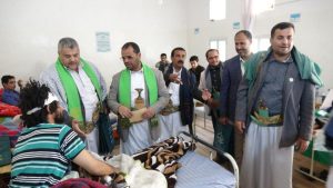 وتبادل الزوار مع الجرحى التهاني بمناسبة ذكرى المولد النبوي الشريف وقدموا لهم هدايا رمزية من السلطة المحلية ومكتب الصحة وفرع المجلس للشؤون الإنسانية .