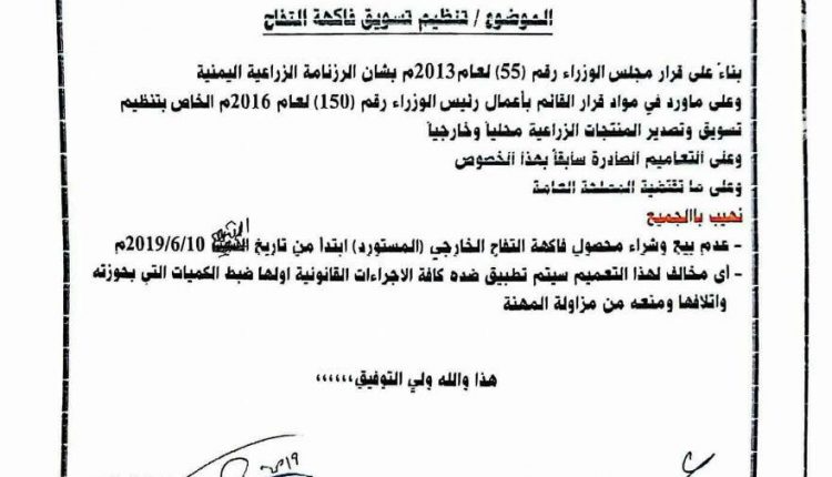 واشار إلى أن ذلك يأتي تطبيقاً للوائح والانظمة المنظمة لعمل الوحدات الفنية الاشرافية على تسويق وتصدير المنتجات الزراعية وبتعاون والتنسيق مع المؤسسات الزراعية الفاعلة .منوها بأنه في الايام القليلة القادمة سيتم اتخاذ اجراءات صارمة وفعالة .
