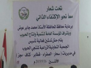 وخلال التدشين الذي حضره المدير العام التنفيذي للمؤسسة العامة لتنمية وأنتاج الحبوب المهندس احمد الخالدأكد وكيل محافظة صعدة لشؤن الخدمات صالح عقاب على اهمية تأسيس الجمعية التعاونية الزراعي لمنتجي الحبوب في أعانة المزارعين على تحسين منتجاتهم من القمح وتوفير متطلبات محاصيل الحبوب المختلفة وارشادهم للطرق السليمة للحصول على منجات ممتازة من الحبوب ..مشددا على المزارعين على ايجاد بنك من مخزون البذور للاستغنى عن استيراد البذور المختلفة التي قديكون ضرر بعضها اكثر من نفها ..مبديا حرص السلطة المحلية على تاسيس الجمعيات لتكون عون للمزارعي في دعم الانتاج الزراعي من الحبوي ..مؤكدا ان السلطة المحلية ستكون الى جانب الجمعيات في تحسين الانتاج الزراعي للوصول الى الاكتفا۽ الذاتي.
