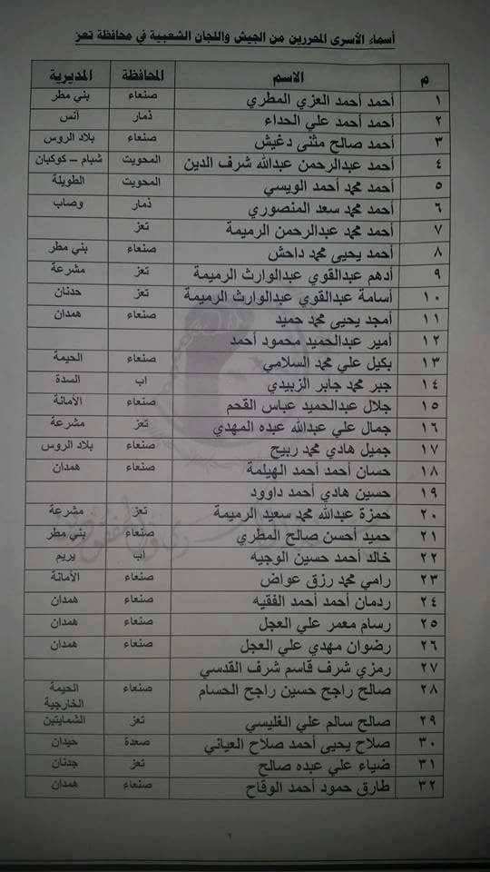 العودة إلى "أسماء 118 أسيراً من أبطال الجيش واللجان الشعبية المفرج عنهم في تعز" كشف-تبادل-الأسرى-1 السابق