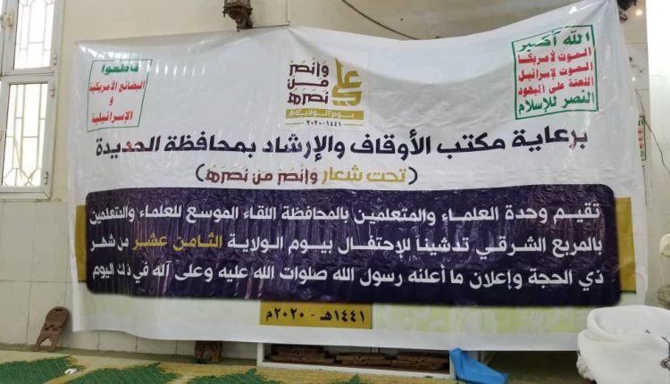 برعاية مكتب الأوقاف والإرشاد نظمت وحدة العلماء والمتعلمين بمحافظة الحديدة صباح اليوم الثلاثاء لقاء تحضيري موسع للعلماء والخطباء والمرشدين بمديريات المربع الشرقي لإحياء ذكرى يوم الولاية وتدشين الفعاليات المرافقة لها في الثامن عشر من ذو الحجة الجاري وإعلان ما أعلنه رسول الله في ذلك اليوم تحت شعار ” وأنصر من نصره “.