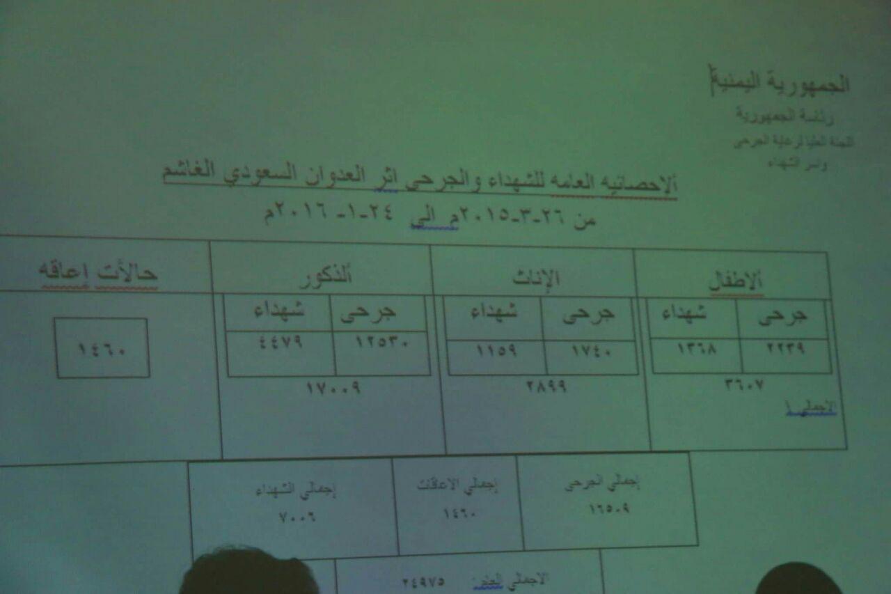 من جانبه قال الناطق الرسمي لوزارة الصحة العامة والسكان الدكتور تميم الشامي في ورقته المقدمة للمؤتمر تحت عنوان “آثار العدوان السعودي الامريكي على الاوضاع الانسانية والمنظومة الصحيفة اليمن” بأن العدوان نتج عنه حتى اليوم استشهاد 1400 من الاطفال، و2300 جريح من الاطفال ، 1800 جريح من النساء واستشهاد 1200 من النساء بالإضافة الى اصابة 12600 من الذكور واستشهاد 4500 من الرجال وإعاقة 1460 اعاقة جزئية وكلية .