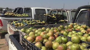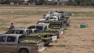 واحتوت القافلة على الف سلة من الرمان والعنب من ثمار الارض الطيبة ومبالغ مالية ومواد عينية متنوعة.