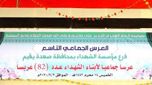 نظمت مؤسسة الشهداء فرع محافظة صعدة اليوم الخميس العرس الجماعي التاسع لـ82 عريسا من أبناء الشهداء بالمحافظة.