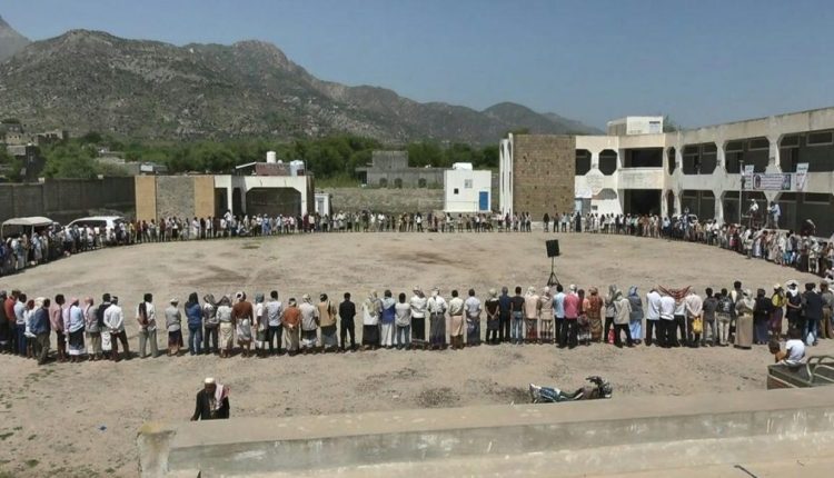 وقفة لأباء الأعروق في حيفان للتنديد باحتجاز العدوان للسفن النفطية