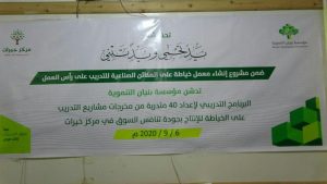 دشنت مؤسسة بنيان التنموية اليوم بمركز خيرات لتدريب وتأهيل الأسر المنتجة بصنعاء، برنامجاً تدريبياً لتأهيل 40 متدربة من مخرجات مشاريع التدريب على الخياطة للإنتاج بجودة تنافس المنتجات المستوردة .