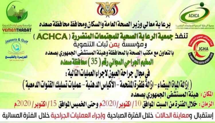 تدشن جمعية الرعاية الصحية للمجتمعات المتضررة ومؤسسة يمن ثبات التنموية بالتعاون مع مكتب الصحة وهيئة المستشفى الجمهوري بصعدة السبت القادم المخيم الطبي المجاني الـ 35 في جراحة العيون.