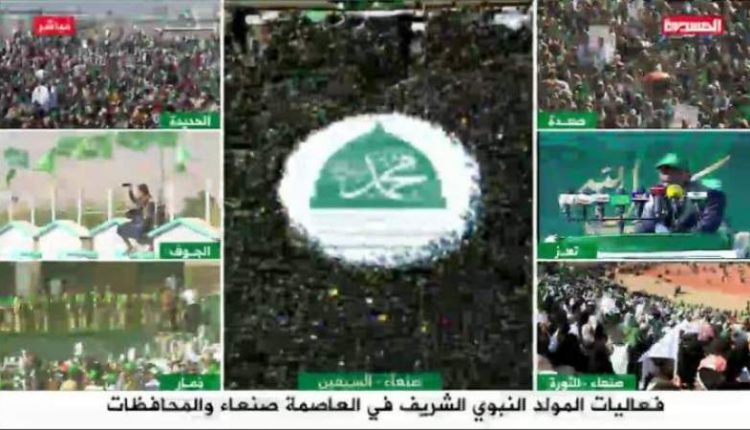 وتشهد العاصمة صنعاء و12 محافظة في هذه اللحظات حشود مليونية للاحتفال بالمولد النبوي الشريف والتي تقام في 15 ساحة كبرى.