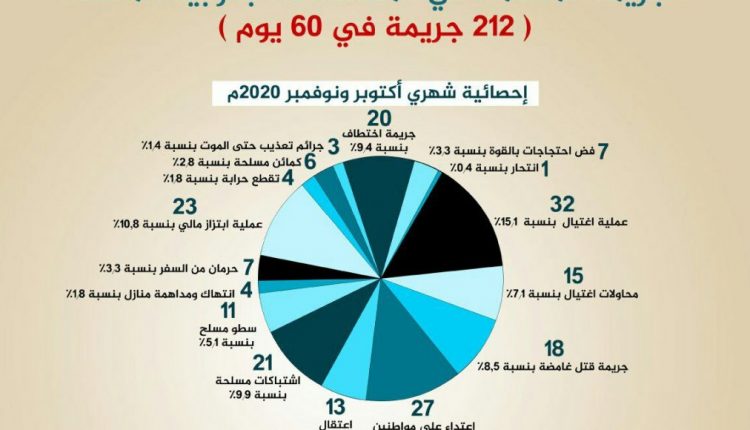 وبلغت جرائم الاغتيالات التي رصدت خلال شهري ” أكتوبر ــ نوفمبر الماضي “، 32 جريمة اغتيال وبنسبة 15,1 % من إجمالي الجرائم المرصودة كما حققت المرتبة الأولى من تلك الجرائم ،وتلتها في الترتيب جرائم الاعتداءات على المواطنين المدنيين العزل من قبل المليشيات الموالية للعدوان بـ 27 جريمة وبنسبة 12,7% ، واحتلت جرائم الابتزاز بقوة السلاح المرتبة الثالثة بـ 23جريمة وبنسبة 10,8% .