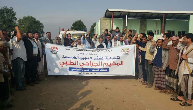 دشنت هيئة المستشفى الجمهوري العام بصعدة اليوم مخيم طبي جراحي مجاني في مديرية الجراحي بمحافظة الحديدة برعاية وزير الصحة العامة والسكان الدكتور طه المتوكل .
