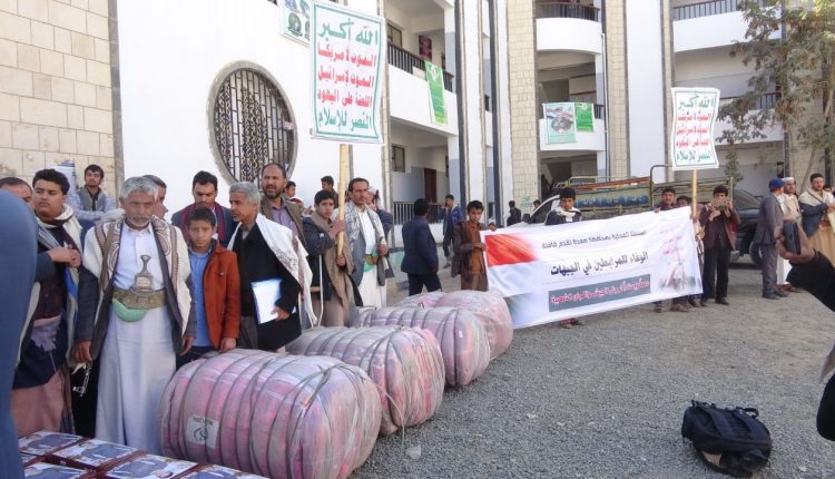 وخلال عرض القافلة التي احتوت على ملابس شتوية، نظم المكتب التنفيذي وقفة احتجاجية للتنديد بتصنيف الإدارة الأمريكية أنصار الله منظمة إرهابية، بمشاركة وزير الشؤون الاجتماعية والعمل عبيد سالم بن ضبيع وأمين عام محلي المحافظة محمد العماد.
