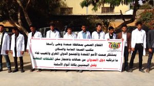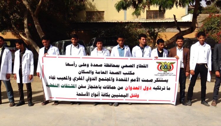نظم القطاع الصحي بمحافظة صعدة اليوم وقفة تنديداً باستمرار دول تحالف العدوان في احتجاز سفن المشتقات النفطية ومنع دخولها إلى ميناء الحديدة .