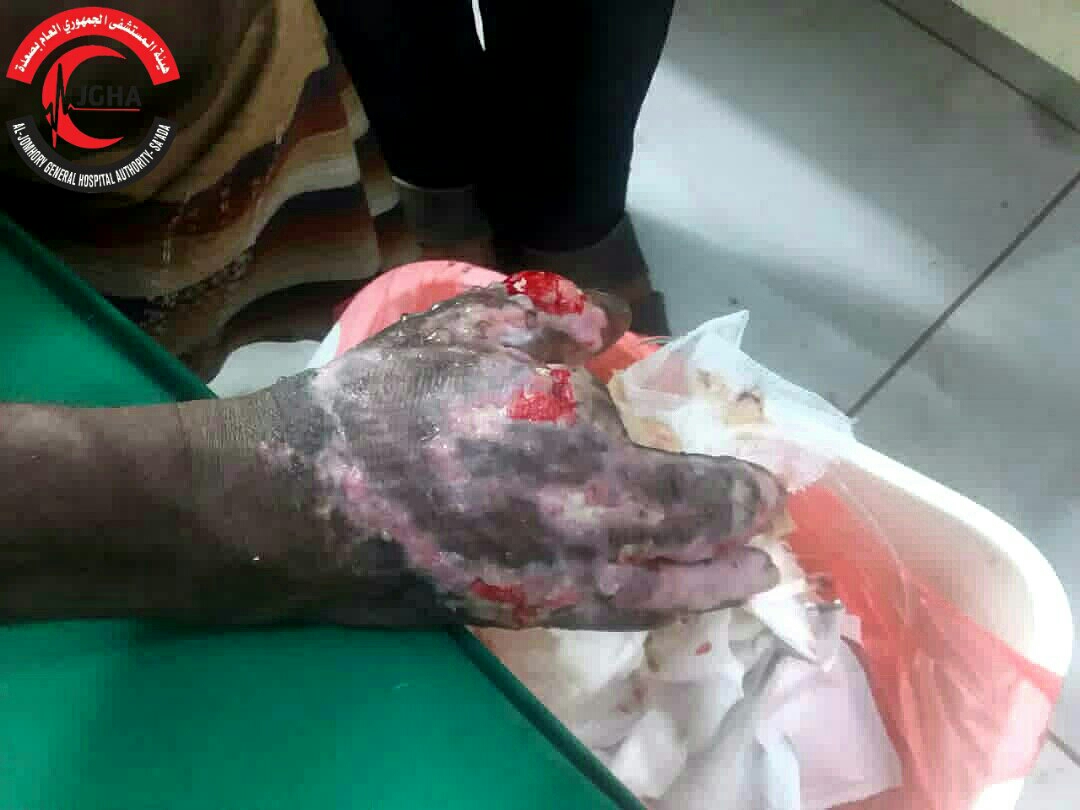 حيث باشر الأطباء في هيئة المستشفي الجمهوري بصعدة إجراء الإسعافات الطبية والعلاجات اللازمة له وتحويله إلى قسم الجراحة لإجراء عملية ترقيع الجلد وتفادي المضاعفات السلبية التي قد تؤدي إلى تأخير أو عدم التئام الجرح، والتعرض للإصابة بالتيبس في اليد وتليّف الجلد