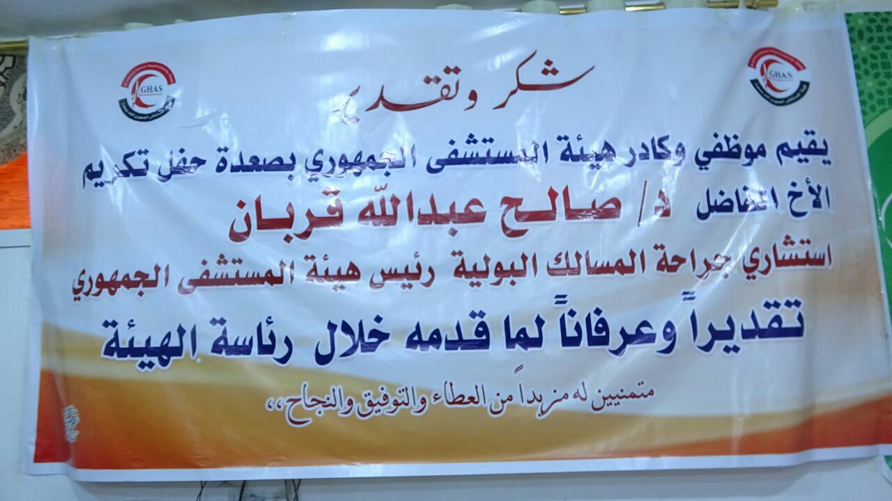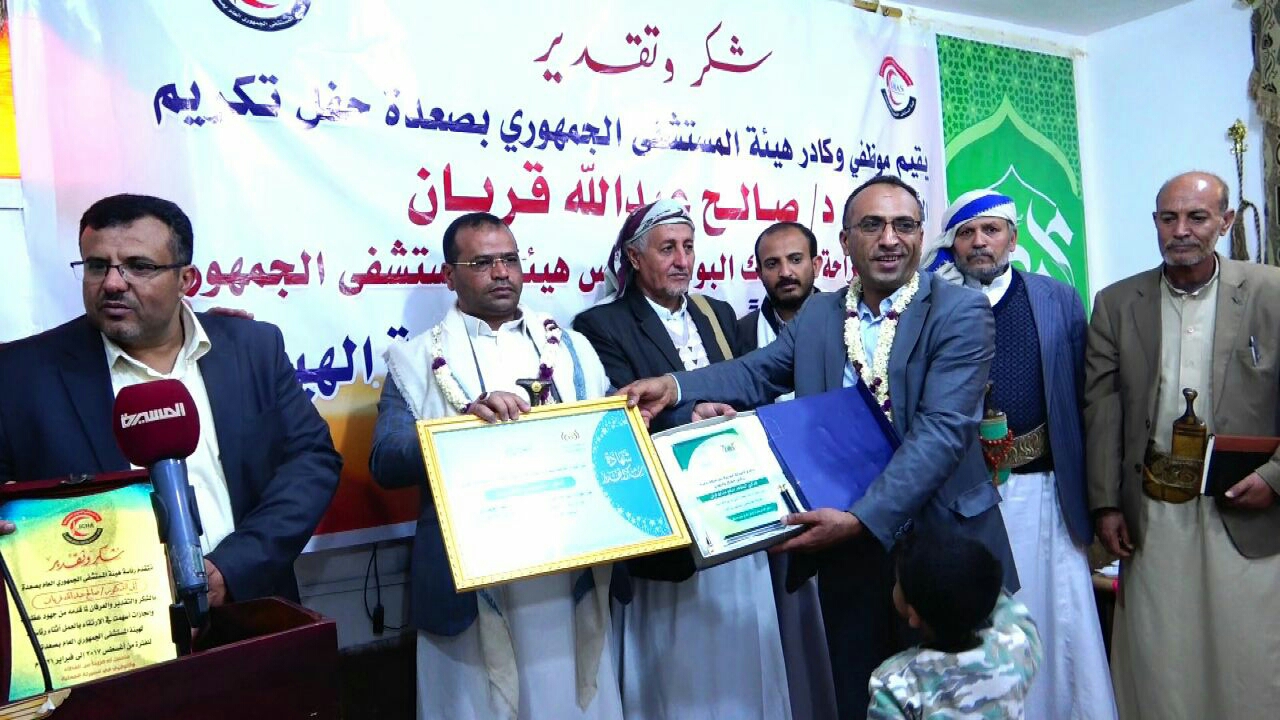 كرمت السلطة المحلية بمحافظة صعدة وموظفي هيئة المستشفى الجمهوري العام بصعدة اليوم رئيس الهيئة السابق بالمحافظة الدكتور صالح عبدالله قربان.