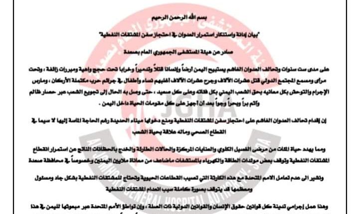 بيان صادر لهيئة المستشفى الجمهوري العام بصعدة إدانة واستنكار استمرار العدوان في احتجاز سفن المشتقات النفطية”