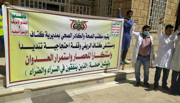 نظم منتسبو الصحه بمديريه كتاف ومستشفى كتاف الريفي بمديرية كتاف اليوم ، وقفة احتجاجية تنديداً بالقرصنة البحرية واستمرار تحالف العدوان الأمريكي السعودي باحتجاز سفن المشتقات النفطية.