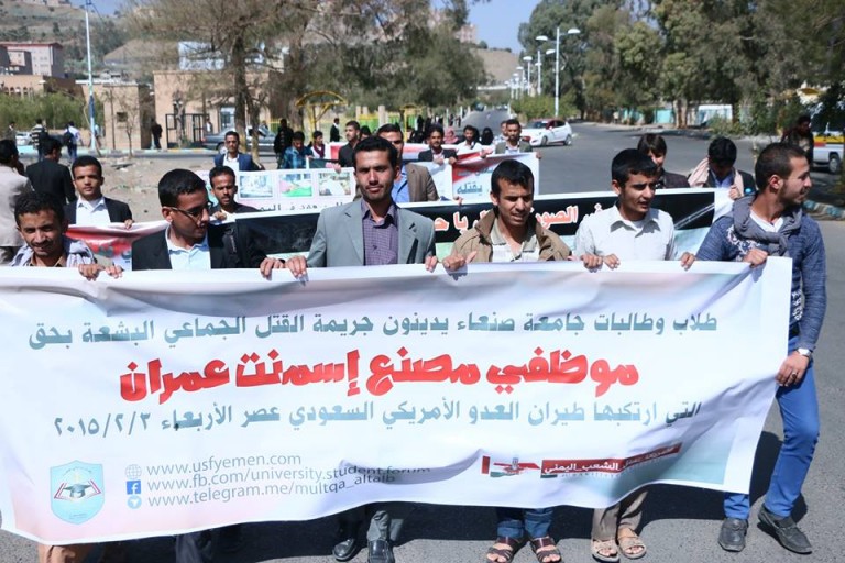 صنعاء |4 فبراير |صعدة:نيوز : نظّم طلاب وطالبات جامعة صنعاء اليوم الخميس مسيرة أعقبها وقفة احتجاجية تنديداً بمجزرتي عمران ونهم التي ارتكبها طيران العدوان السعودي الأمريكي بحق المواطنين يوم أمس.
