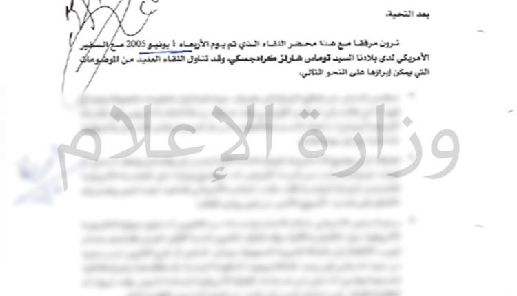 وكشفت وثائق وزارة الإعلام طلب السفير الأمريكي في صنعاء عام 2005 توماس كرادجسكي من خارجية نظام صالح الضغط لرفع المقاطعة العربية لكيان العدو .. كما طلب كرادجسكي من نظام صالح وقف مقاطعة الشركات التي تتعامل مع كيان العدو من الدرجة الأولى والثانية والثالثة.