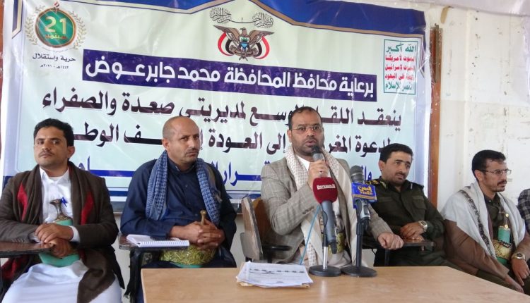 دعا لقاء موسع لمديريتي صعدة والصفراء نظمته السلطة المحلية بمحافظة صعدة اليوم، المغرر بهم للعودة إلى صف الوطن والاستفادة من قرار العفو العام.