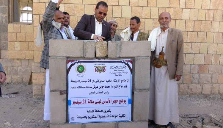وضع محافظ صعدة محمد جابر عوض ، حجر الأساس لصالة 21 سبتمبر التابعة لمكتب الثقافة في المحافظة بالتزامن مع الاحتفال بالعيد السابع لثورة الحادي والعشرين من سبتمبر.