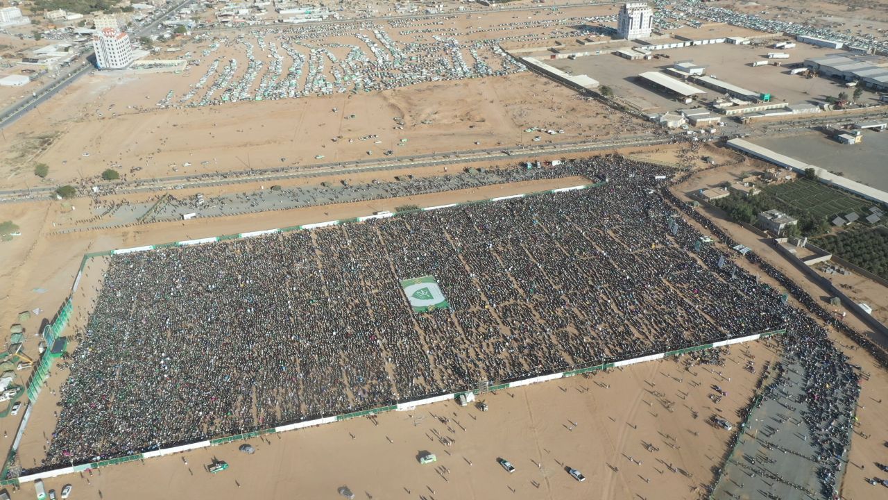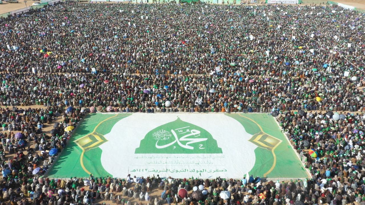 وتوسطت الحشود الجماهيرية لوحة كُتب عليها أسم النبي محمد -صلى الله عليه وسلم- وعبارات “لبيك يا رسول الله”