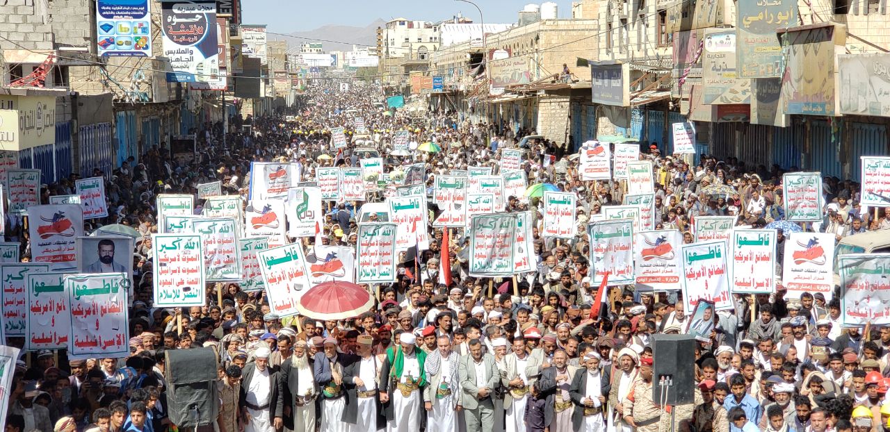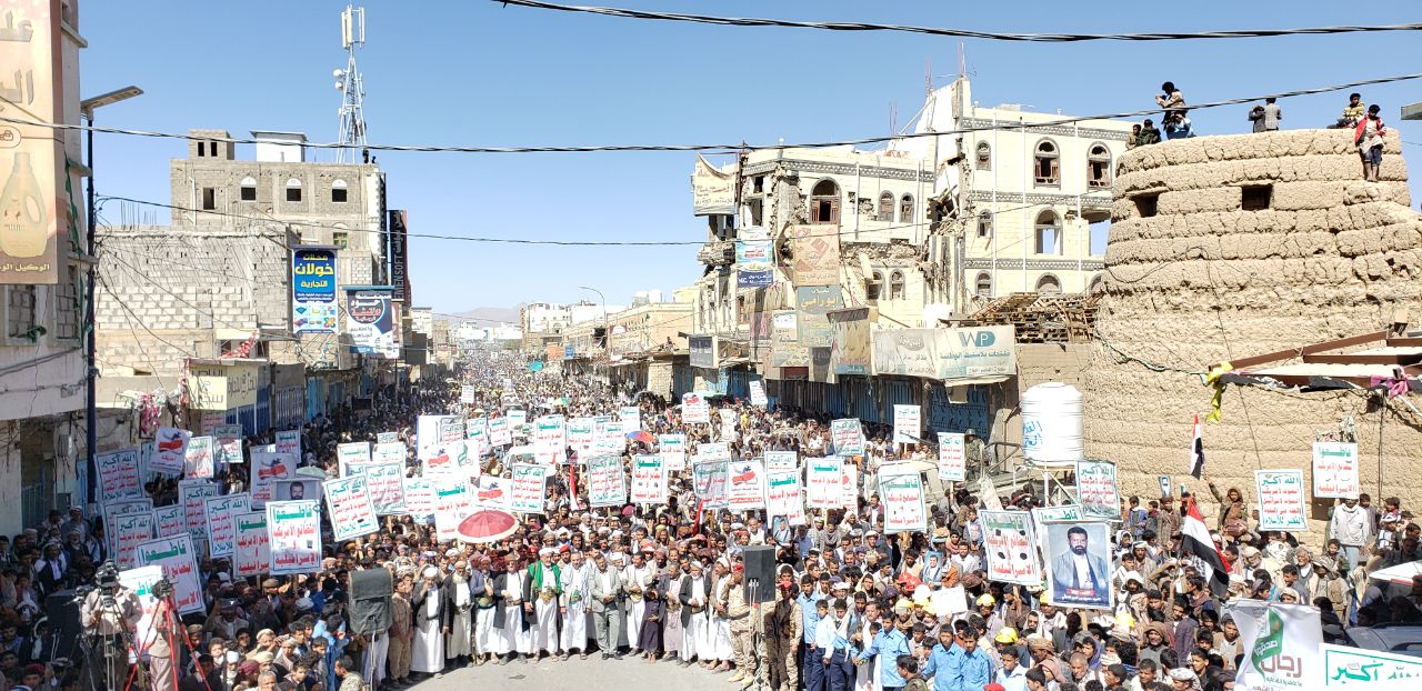 وردد المشاركون في المسيرة، الهتافات وحملوا لافتات حمّلت أمريكا مسؤولية التداعيات الكارثية الناتجة عن استمرار العدوان والحصار الجائر، وتفاقم معاناة الشعب اليمني.