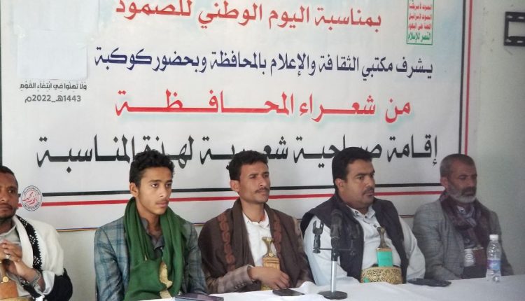 وفي الصباحية الشعرية بحضور عدد من وكلاء المحافظة ومدراء المكتب التنفيذي أوضح مدير مكتب الثقافة يحيى الحمزي أن الفعالية تأتي في إطار تدشين فعاليات المكاتب والقطاعات الرسمية بالمحافظة بمناسبة اليوم الوطني للصمود.