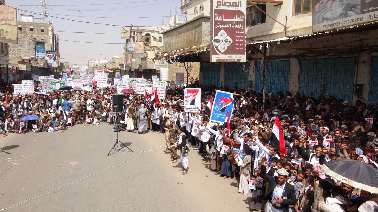 وندد المشاركون في المسيرة التي تقدّمتها قيادة السلطة المحلية وعلماء وقيادات أمنية وعسكرية، الهتافات المنددة بتصعيد تحالف العدوان الأمريكي السعودي الإماراتي وما يفرضه من حصار واحتجاز لسفن المشتقات النفطية.