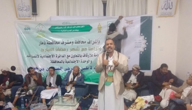 نظّم مكتب الهيئة العامة للأوقاف بمحافظة ذمار بالتنسيق مع الدائرة الاجتماعية لأنصار الله والوحدة الاجتماعية اليوم الاثنين ، أمسية رمضانية ومأدبة إفطار وتكريم جرحى ومعاقي العدوان تحت شعار ” عزائم لا تلين”.
