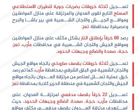 - رصد خروق بقصف مدفعي وصاروخي وإطلاق النار من قوى العدوان والمرتزقة على منازل المواطنين ومواقع الجيش واللجان في عدد من المحافظات