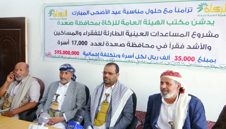 دشن فرع الهيئة العامة للزكاة في محافظة صعدة، اليوم، مشروع توزيع المساعدات العينية للفقراء والمساكين والأشد فقراً، بمناسبة عيد الأضحى.