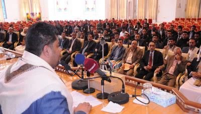 وقال : “قبل ان اصل الى القاعة كانت اخبار الانتصارات في مختلف الجبهات وهي الرسالة التي تؤكد على اننا لن نقبل الاستسلام والهزيمة وان اليمني الذي يخرج من تحت الركام متحديا ولا يقبل النزوح والفرار من ارضه وان كان لا يجد قوت يومه ..ولو واجه اي شعب اخر الحصار والعدوان الذي شن على اليمن لكانت المأساة كبيرة ولكان النزوح بمئات الالاف ، وكما تقول الاحصائيات الدولية فان ما يقرب من واحد وعشرون مليون يحتاجون للمساعدة اثر العدوان ، ولكن هذا الشعب يعرف عدوه ويعرف ان اي تنازلات يقدمها لا يمكن ان تجدي وقد حاول الجميع ان يقدم التنازلات من اجل ايقاف الدم اليمني الذي تسفكه امريكا من اجل اسرائيل ومصالح اسرائيل، والمتشدقون بالعروبة لا يستطيعون حتى ان يسمعونا فتوى من مفتي السعودي ضد اسرائيل او ان يحركوا ربع الجيوش التي تحرك ضد اليمن ضد اسرائيل ، ونحن نتحداهم ليتقاسموا المعركة بيننا وبين اسرائيل ،الشعب اليمني لم يطلب اكثر من حريته واستقلاله وعدم خضوعه للوصاية”..