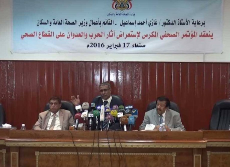 مؤتمر صحفي لوزارة الصحة العامة بصنعاء لرصد جرائم العدوان