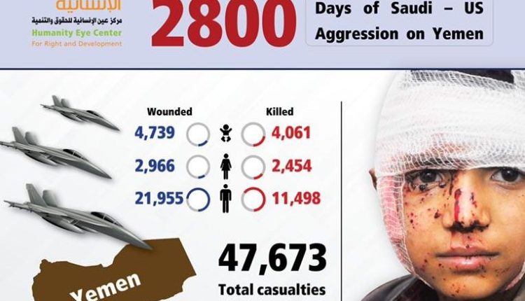 أصدر مركز عين الإنسانية ، اليوم السبت، تقريراً يوثق جرائم العدوان الأمريكي السعودي الإماراتي بحق الشعب اليمني خلال 2800 يوم من العدوان.