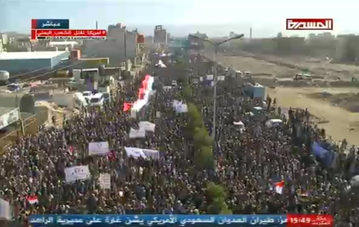 صنعاء| 19 فبراير | صعدة :نيوز: تشهد جولة آية بشارع مأرب شمال العاصمة صنعاء الآن حشدا جماهيريا كبيرا تحت شعار ” تحرير اليمن مسئوليتنا جميعاً ” والذي يبث على الهواء مباشرة عبر قناة المسيرة الفضائية، في مظاهرة حاشدة دعت لها الثورية العليا يوم أمس.
