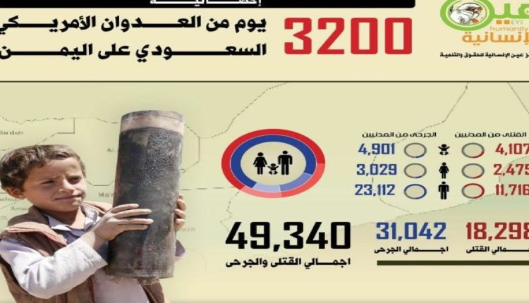 استشهاد وجرح 49340 موطناً خلال 3200 يوم من العدوان الأمريكي السعودي على اليمن