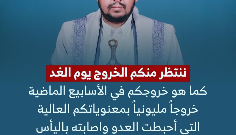 السيد القائد لجماهير الشعب: ننتظر منكم الخروج يوم الغد كما هو خروجكم في الأسابيع الماضية خروجاً مليونياً بمعنوياتكم العالية التي أحبطت العدو واصابته باليأس