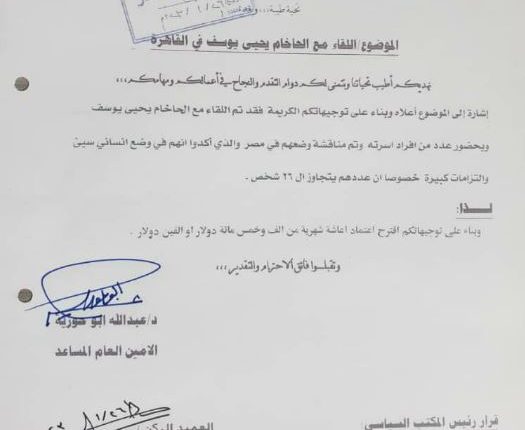 وأظهرت مذكرة صادرة عن مكتب الخائن طارق برقم (58) توجيهه لجنة كلفها بلقاء حاخام الطائفة اليهودية في اليمن يحيى يوسف موسى، المقيم بالعاصمة المصرية القاهرة، بصرف 52 ألف دولار شهرياً له ولأسرته المكونة من 26 شخصاً.