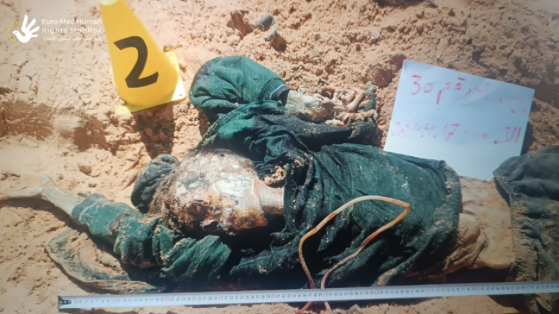 ودعا المرصد الأورومتوسطي جميع الجهات الدولية المختصة بالتعاون والمشاركة في تحديد هوية الجثامين التي دفنت في هذه المقابر الجماعية ممن لم يتم التعرف عليهم حتى الآن.
