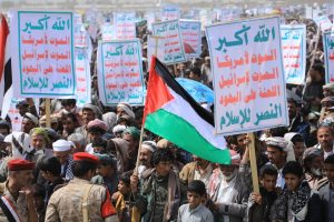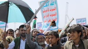 ورفع المحتشدون الأعلام اليمنية والفلسطينية ورايات الحرية والبراءة من أعداء الله والداعية إلى مقاطعة البضائع الأمريكية والإسرائيلية، هاتفين بعبارات الغضب والسخط ضد أمريكا وكيان العدو الصهيوني لما يرتكبونه من جرائم وانتهاكات بحق الشعب الفلسطيني.
