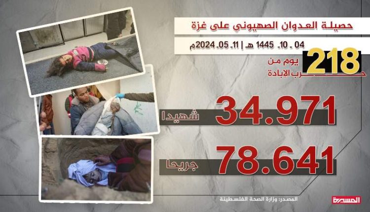 قرابة 35 ألف شهيد في 218 يوما من المجازر الصهيونية بغزة