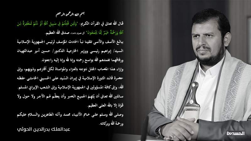 وأضاف السيد القائد “إزاء هذا الصاب الجلل نتوجه بالعزاء والمواساة لكل أقاربهم وذويهم، وإلى قائد الثورة الإسلامية في إيران السيد علي الخامنئي وكافة المسؤولين في إيران وإلى الشعب الإيراني المسلم”.