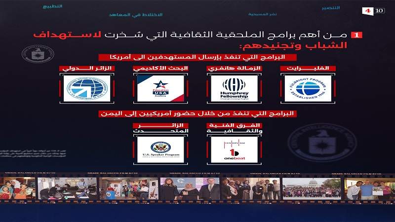 ويقول الجاسوس شايف الهمداني عن أهداف الملحقية الثقافية بالسفارة الأمريكية: “الظاهر لهذه البرامج هو تبادل المعلومات والمنفعة الثقافية والتعليمية بين الشعوب، لكن في الحقية هو بناء علاقات واستقطاب شخصيات مؤثرة في مختلف شرائح المجتمع من سياسيين واقتصاديين وأكاديميين وغيرهم من شرائح المجتمع، وذلك بغرض أن يتم السيطرة على هؤلاء الأشخاص مما يسهل الحصول على معلومات منهم، وأيضاً التأثير على القرار في مختلف شؤون الحياة في اليمن مما يضمن السيطرة الأمريكية على هذا القرار، وعلى المؤسسات التي يعملون فيها من خلال مشاركتهم في هذه البرامج، بحيث يصبحون مصادر معلومات في هذا الجانب.