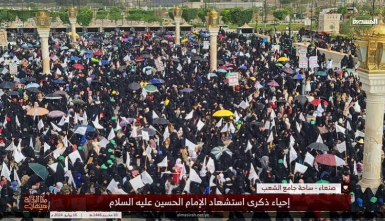 أحيت حرائر العاصمة صنعاء، عصر اليوم الثلاثاء، ذكرى استشهاد الإمام الحسين عليه السلام بمسيرة كبرى في ساحة جامع الشعب تحت شعار: “هيهات منا الذلة” للعام 1446هـ.