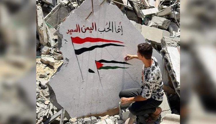 ومن بين الركام يرتسم العلم اليمني بجوار العلم الفلسطيني في غزة مع عبارة “إنما الحُب اليمن”
