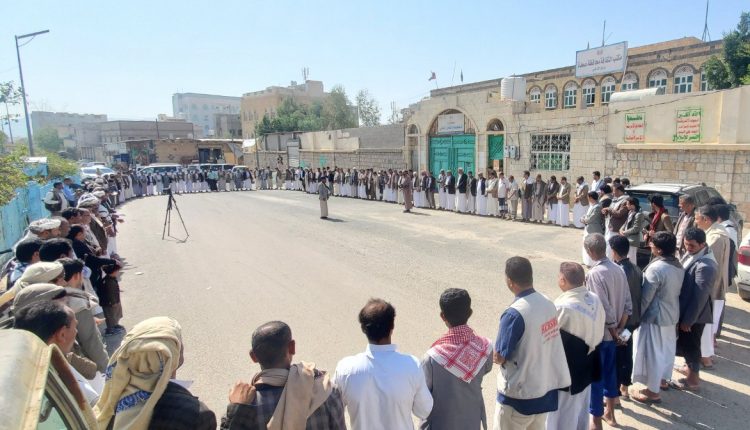 وقفة للسلطة المحلية بصعدة للتنديد بجريمة العدو الصهيوني بحق النازحين بغزة