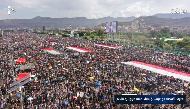من ميدان السبعين وفي صعيد الإسناد لفلسطين.. صوت مليوني زخار برسائل الشعب وهو يجدد تفويض قائده ويبارك تشكيل حكومته ويؤكد وفاءه مع غزته.. مليونية “”نصرة للأقصى وغزة.. الإسناد مستمر والرد قادم”