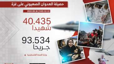 وأعلنت ارتفاع حصيلة العدوان الإسرائيلي إلى 40435 شهيدًا و93534 إصابة منذ السابع من أكتوبر الماضي.