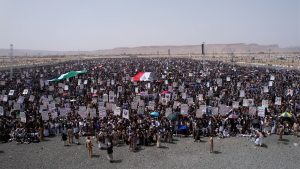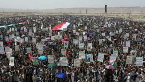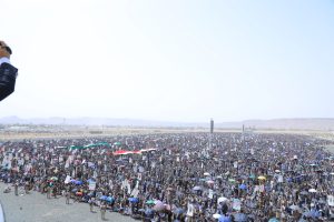 وأضاف” “فها نحن نخرج رغم القصف المستمر مستجيبين لله سبحانه وتعالى، ولكتابه الكريم، ولرسوله صلوات الله عليه وعلى آله، ولقائدنا العلم السيد عبد الملك بدر الدين الحوثي (يحفظه الله)”.