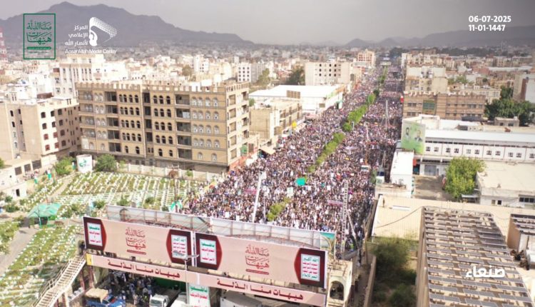 على خَطِّ الحسين، وبينَ مظلومية كربلاء ومظلومية غزةَ وكلّ فلسطين، خرج الشعبُ اليمني الثائر العظيمُ، خروجًا مليونيًّا عاشورائيًّا ثوريًّا تحرّريًّا؛ إحياءً لذكرى استشهاد الإمام الحسين بن علي -عليهما السلام- “عاشوراء”، تحت شعار “هيهات منّا الذلة”.